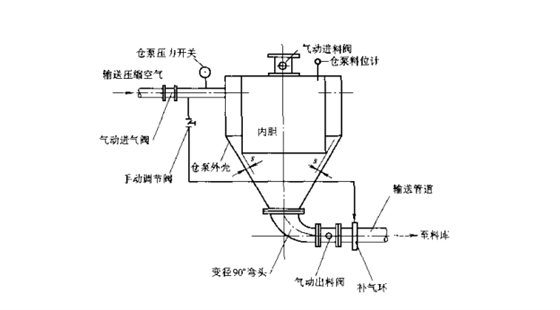 當(dāng)L型倉(cāng)泵裝料達(dá)到預(yù)先設(shè)定的高料位時(shí),料位計(jì)發(fā)出輸出信號(hào),關(guān)閉氣動(dòng)進(jìn)料閥,開(kāi)啟L型倉(cāng)泵氣動(dòng)進(jìn)氣閥。