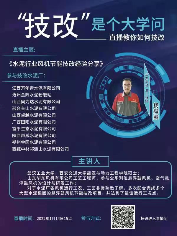 雖然,現(xiàn)在大家都知道了磁懸浮鼓風(fēng)機的優(yōu)點,那么是不是所有的水泥廠都可以更換為磁懸浮風(fēng)機呢?水泥企業(yè)在選擇磁懸浮風(fēng)機時應(yīng)該注意什么?日常應(yīng)該怎樣維護和保養(yǎng)磁懸浮風(fēng)機呢?上面的這幾個問題其實也是水泥廠的決策層和各個部門所關(guān)心的問題。帶著這些問題,本周五(1月14日)15:00,擁有豐富的水泥廠節(jié)能技改經(jīng)驗的華東風(fēng)機總工程師楊耀鵬將做客水泥內(nèi)參的直播間,和大家一起聊一聊“能耗雙控”的大背景下,水泥行業(yè)風(fēng)機節(jié)能改造那些事!